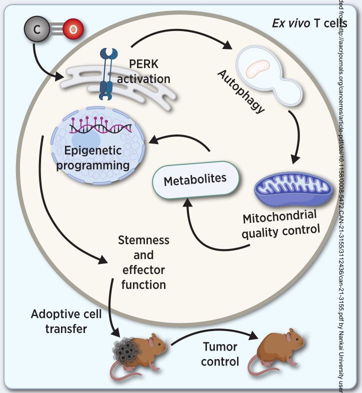 近日,H·李·莫菲特癌症中心与研究所的研究者们在Cancer research杂志上发表了题为“Carbon monoxide activates PERK-regulated autophagy to induce immunometabolic reprogramming and boost anti-tumor T cell function”的文章,该研究表明,ERS激活的自噬途径改变了线粒体的功能,并从表观遗传学上将T细胞重新编程为更好的抗肿瘤表型,以实现强大的肿瘤控制。