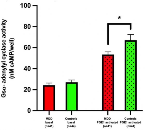 PGE-1 stimulated cAMP signaling response in platelets is significantly lower in subjects with MDD than healthy controls.与健康对照相比,异源三聚体G蛋白(Gsα,Gsalpha)主要位于重度抑郁症患者机体的脂质筏结构中,从而就会导致其机体的腺苷酸环化酶的刺激受损。近日,一篇发表在国际杂志Molecular Psychiatry上题为“A novel peripheral biomarker for depression and antidepressant response”的研究报告中,来自伊利诺伊大学等机构的科学家们通过研究开发了一种新型血液检测技术,其或能为诊断抑郁症提供一种简单的生化标志物,同时也能揭示个体患者接受药物疗法的治疗效果。