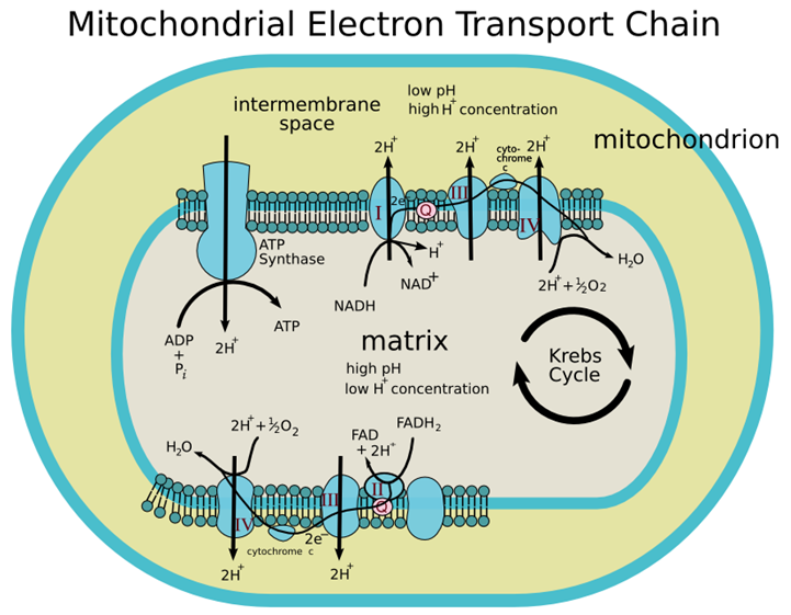 氧气是在呼吸作用所涉及的一系列化学反应的最后出现的。电子通过位于线粒体内膜中称为嵴的结构中的蛋白链。这促使氧和氢原子形成水,泵送质子穿过细胞膜,这接着又促使ATP的形成,而ATP是细胞的化学能量储存单位。这种电子传递链是人类和其他真核生物基于氧气的呼吸作用的基础。
