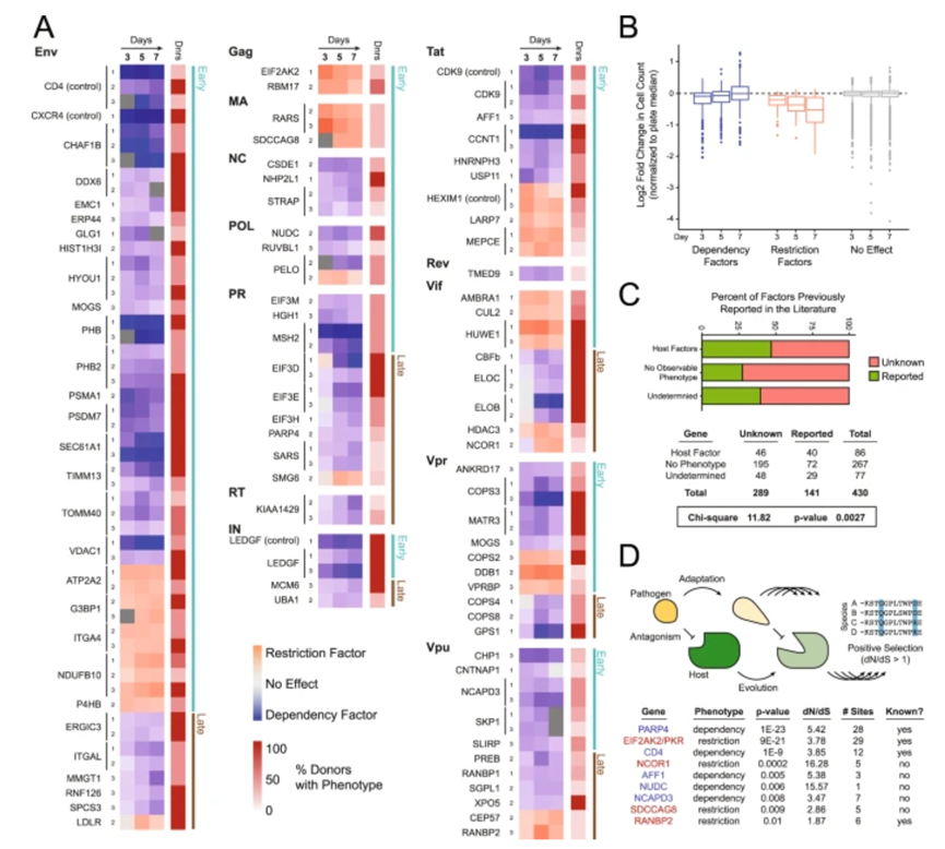 研究人员在364个靶向基因中实现了有效的敲除(>50%的等位基因),并确定了86个改变HIV感染的候选宿主因子。这些因子中有47个通过独立供体中的多重基因编辑进行验证,包括23个具有限制性活性的因子。这23个限制因子在敲除时增加HIV复制,而62个基因产生依赖因子表型,减少敲除时HIV复制;一个基因PELO产生了依赖于供体的冲突表型。进一步研究发现,在候选依赖性因子中,细胞计数随着时间的推移而增加,与保护免受持续病毒感染的细胞病变效应一致。而限制因子敲除后细胞计数随时间推移而减少,与病毒感染增加和细胞死亡增加一致。没有表型但具有有效编辑的因子导致细胞计数随时间没有显着变化。基因编辑效率和HIV-1表型在独立供体中高度一致。在86个候选宿主因子中,40个先前与NCBI基因参考功能(GeneRIF)数据库中的HIV感染有关,而46个未曾报道过在HIV感染中的作用,且其中几个代表了潜在的药物靶点,为理解HIV生物学提供了许多新的途径。