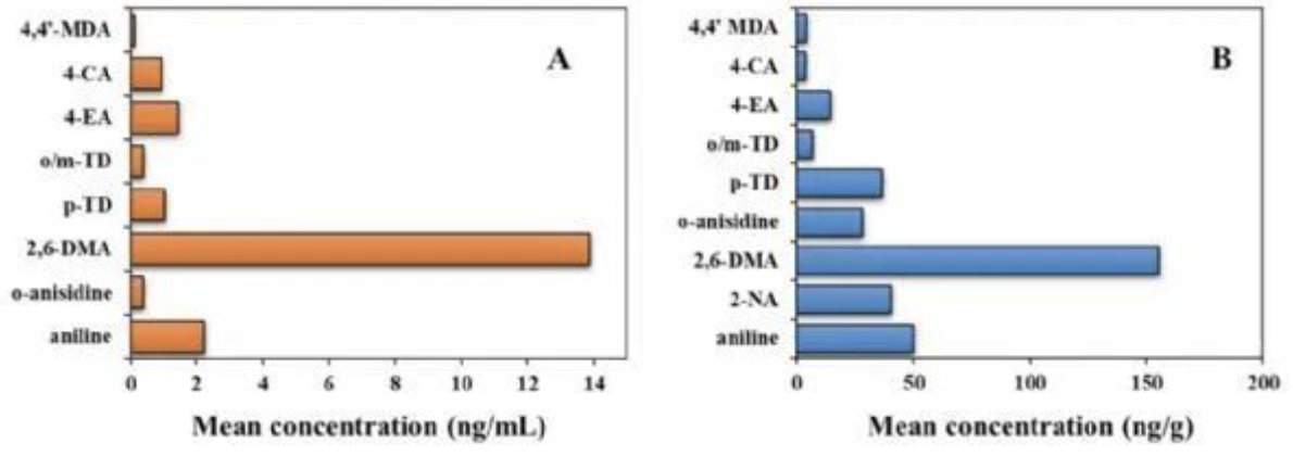 他补充说,“这些结果表明,除了这种直接接触外,宠物很可能是间接接触。例如,过去的研究表明,一种叫做双甲脒药物,是一种广谱性甲脒类杀螨杀虫剂,属中等毒性杀螨剂。而双甲脒可以被消化系统中的微生物分解为一种叫做2,6-二甲基苯胺的芳香胺,这是在新研究中检测到的最常见的芳香胺,在狗身上发现的芳香胺的近70%,在猫身上发现的芳香胺的近80%。