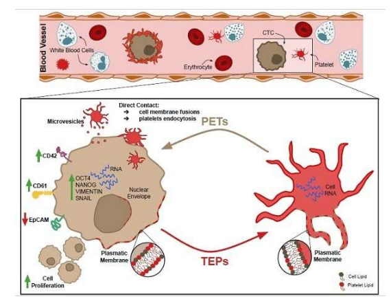 这篇研究报告中,研究人员通过研究首次阐明,血小板或许能将注入脂质、蛋白质和核糖核酸等特殊的生物分子转移到循环肿瘤细胞中,从而帮助这些细胞在血液中不会宿主机体所识别,话句话说,肿瘤细胞能获得血小板的部分配置,从而诱骗机体以为其是血小板,从而就能促进癌细胞迅速扩散到机体其它器官中。