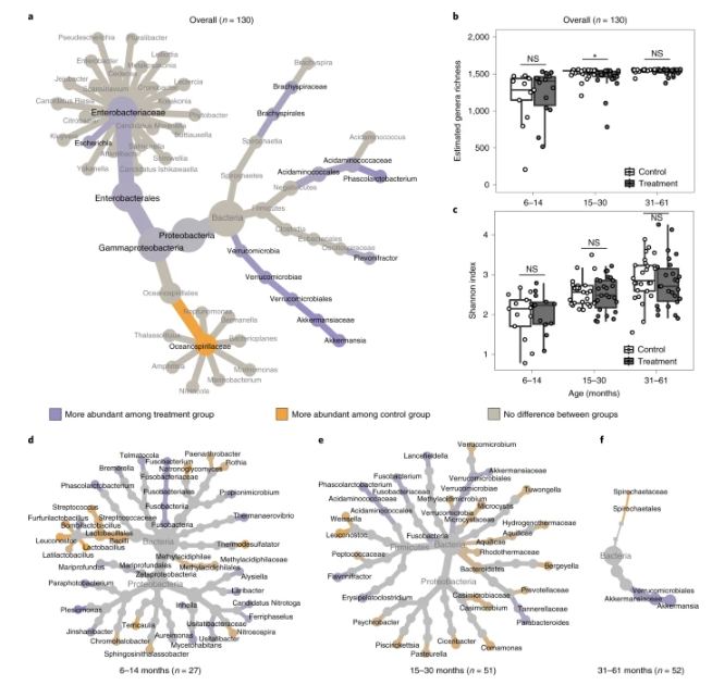 在本研究中,研究人员检查了来自对照组(n = 64)和治疗组(n = 66)的130名儿童的粪便巨基因组。最终分析中包含的样本在两个研究地点(达卡乌丹和通吉)和三个预先指定的年龄层(6-14个月,15-30个月,31个月及以上)之间平衡,对应于肠道微生物组发育的不同阶段。